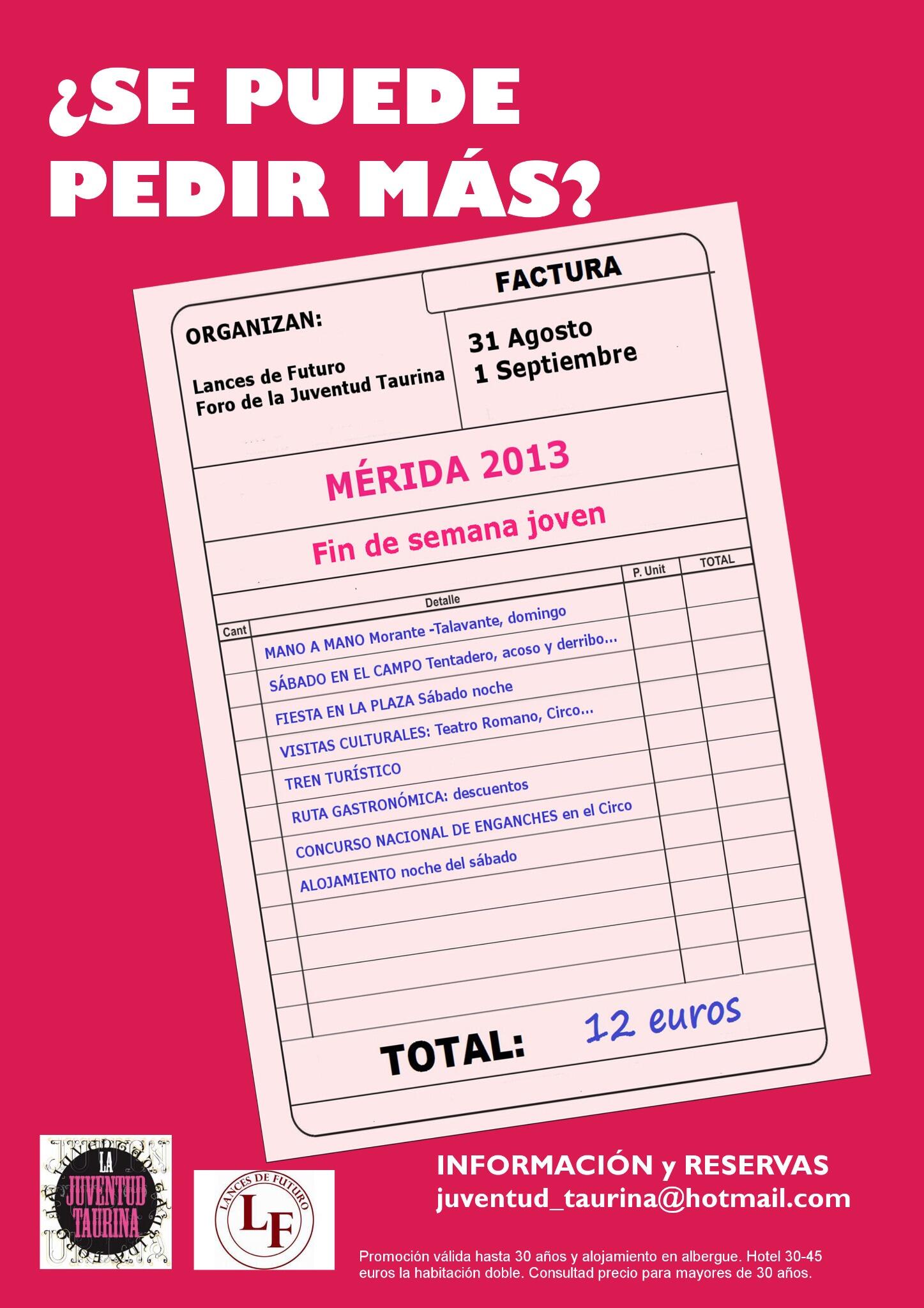 Una propuesta interesante para los jóvenes que deseen disfrutar de una extraordinaria corrida de toros, con dos grandes del toreo en la actualidad, aderezado con un programa de visitas a monumentos Romanos de la Ciudad de Mérida. Un sábado de campo, con tentadero y faenas de acoso y derribo. Jornadas gastronómicas, Concurso Nacional de enganches. Fiestas en la plaza de toros en sábado noche. Un paquete de dos días interesante y aun precio si cabe mas interesante aún, todo esto por tan solo 12 euros.
