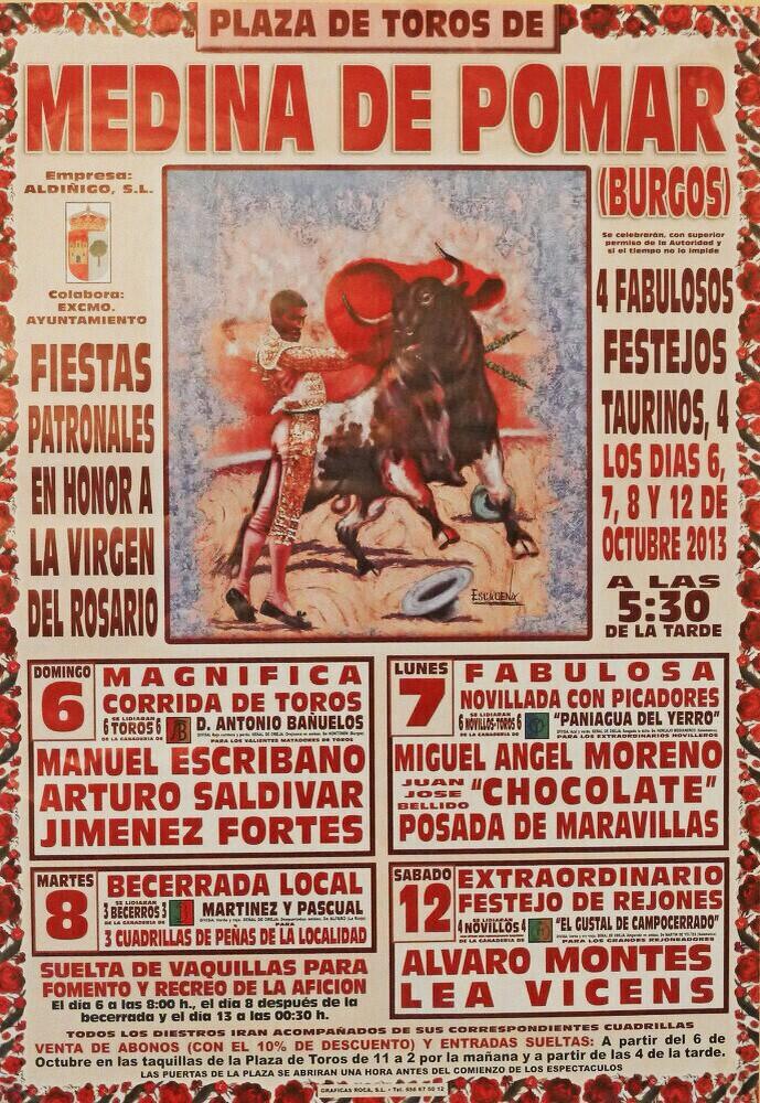 En la Plaza de Toros Burgalesa de Medina de Pomar, con motivo de sus Fiestas Patronales en Honor a la Virgen del Rosario, se programan cuatro espectáculos taurinos para los días 6, 7, 8 y 12 de Octubre de 2013.